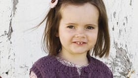 Materialer: "Mini Alpakka" (100% alpakkauld/50 g = 150 meter): (150) 150 (150) 200 (200) g grålilla nr. 4853. Rundp nr. 2½ og 3. 3 knapper. Velourbånd: (80) 85 (90) 95 (100) cm, 10 mm bredt. (Garn fra Sandnes Garn, tlf. 49 76 39 69).