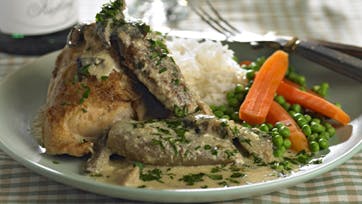 Server kyllingestykkerne i saucen med små kartofler eller løse ris og dampede gulerødder og ærter til.