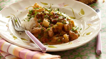 Skær kyllingen i mundrette stykker og brun dem i olien. Skær løgene i tern. Skær champignonerne i skiver og svits dem let sammen med løgene. Tilsæt chorizopølsen i tern, hele rosenpeber og bladselleri i skiver og lad det svitse med et par min. Tilsæt tomatpuré, bouillon og fløde og lad retten simre i 15 min. Tilsæt ærterne og jævn retten med majsstivelse rørt ud i lidt vand. Smag retten til og servér den med kogte ris og drysset med hakket persille.