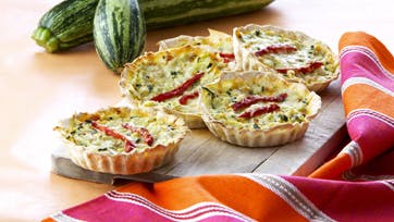 Grill peberfrugten, så den bliver sort, og læg den i en frysepose. Svits løg og courgetter i smørret og krydr med salt og peber. Hak artiskokhjerterne og vend dem i courgetterne sammen med flødeost og emmentaler. Gnid skallen af peberfrugten og skær den i strimler. Rul filodejen ud og pisk ægget. Pensl dejpladerne med æg og læg dem sammen i fire lag. Beklæd 6 små tærteforme med dejen og fordel fyldet deri. Læg peberfrugtstrimlerne over fyldet og drys med parmesan. Bag tærterne ved 200° i 12 min. og server dem lune eller kolde.