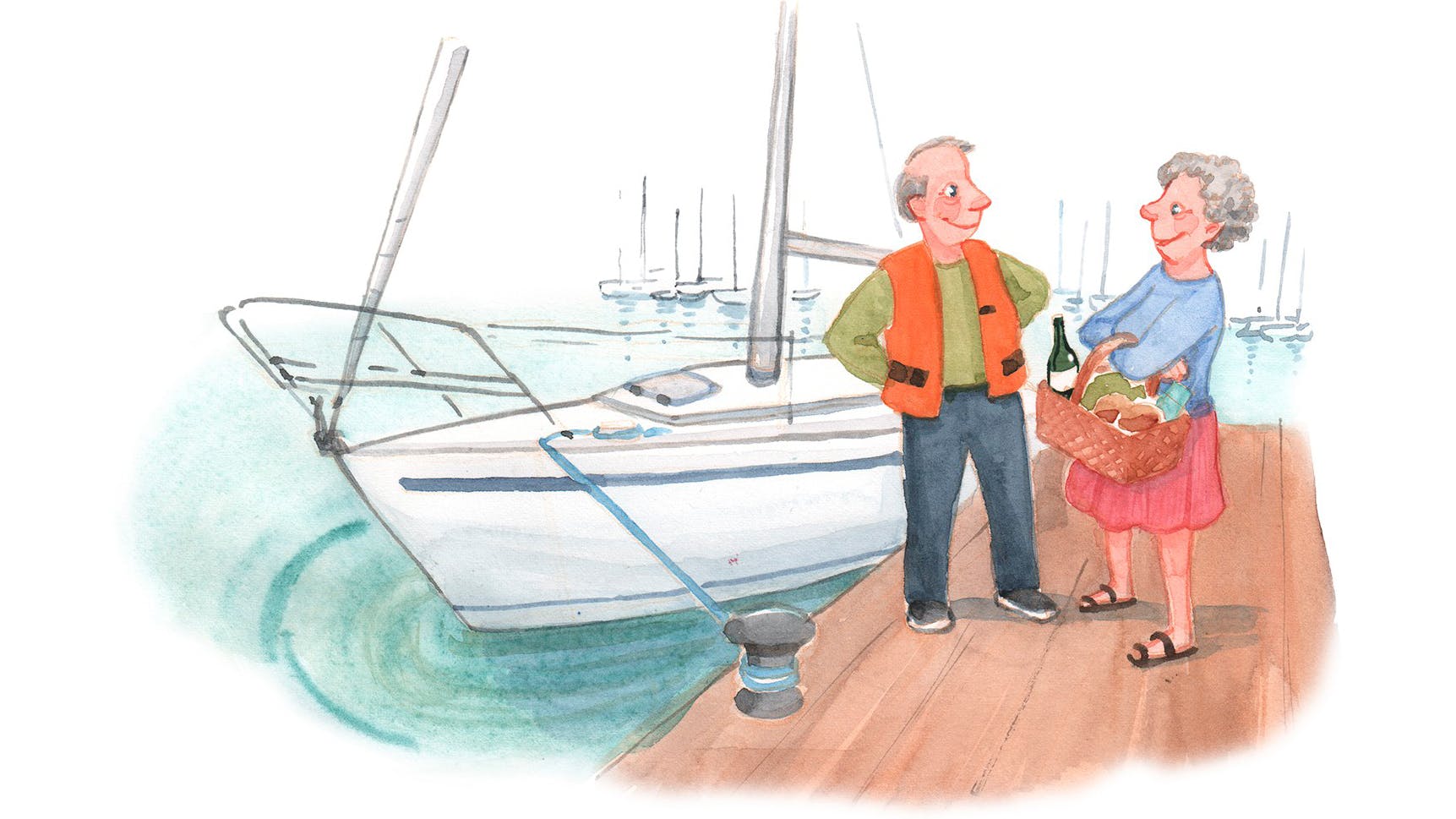 Da jeg valgte at ”gå i land”, blev min mand nervøs for, om jeg ville have ham til at sælge båden. Nej, det ville jeg bestemt ikke, for jeg får altid en glad og meget tilfreds mand hjem til mig. Derimod tilbød jeg ham, at lige meget hvor han ønskede at sejle hen, så skulle jeg nok komme frem til ham i bil med friske forsyninger af mad og rent tøj. Han forberedte så båden, så den kunne betjenes fra cockpittet med diverse sejl, og vi fik en indenbordsmotor, så jeg heller ikke skulle bekymre mig om det. Det mente han ikke var nødvendigt, da han sejlede kapsejlads i 40 år, men jeg insisterede.