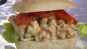 Skær kødet i mundrette stykker. Hak champignonerne fint og skær aspargesene i stykker. Bland kød, champignoner, asparges og ærter i en skål. Rør cremefraichen med mayonnaise og smag til med chilisauce, paprika, salt og peber. Steg baconskiverne sprøde og halver sandwichbollerne. Læg bollerne sammen med salatblade, kyllingesalat, tomatskiver og bacon og server.