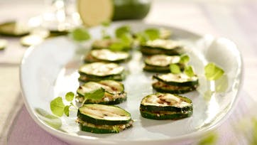 Riv osten og hak hvidløg, oregano og persille fint. Bland ost og krydderurter, hak nødderne og vend dem i. Skær courgetten i 2-3 mm tynde skiver og læg skiverne sammen to og to med en teskefuld af osteblandingen imellem. Steg courgettesandwichene på en grillpande ved middelhøj varme i 1 min. på hver side. Server sandwichene som en lille snack eller som tilbehør til en god kalvesteg.