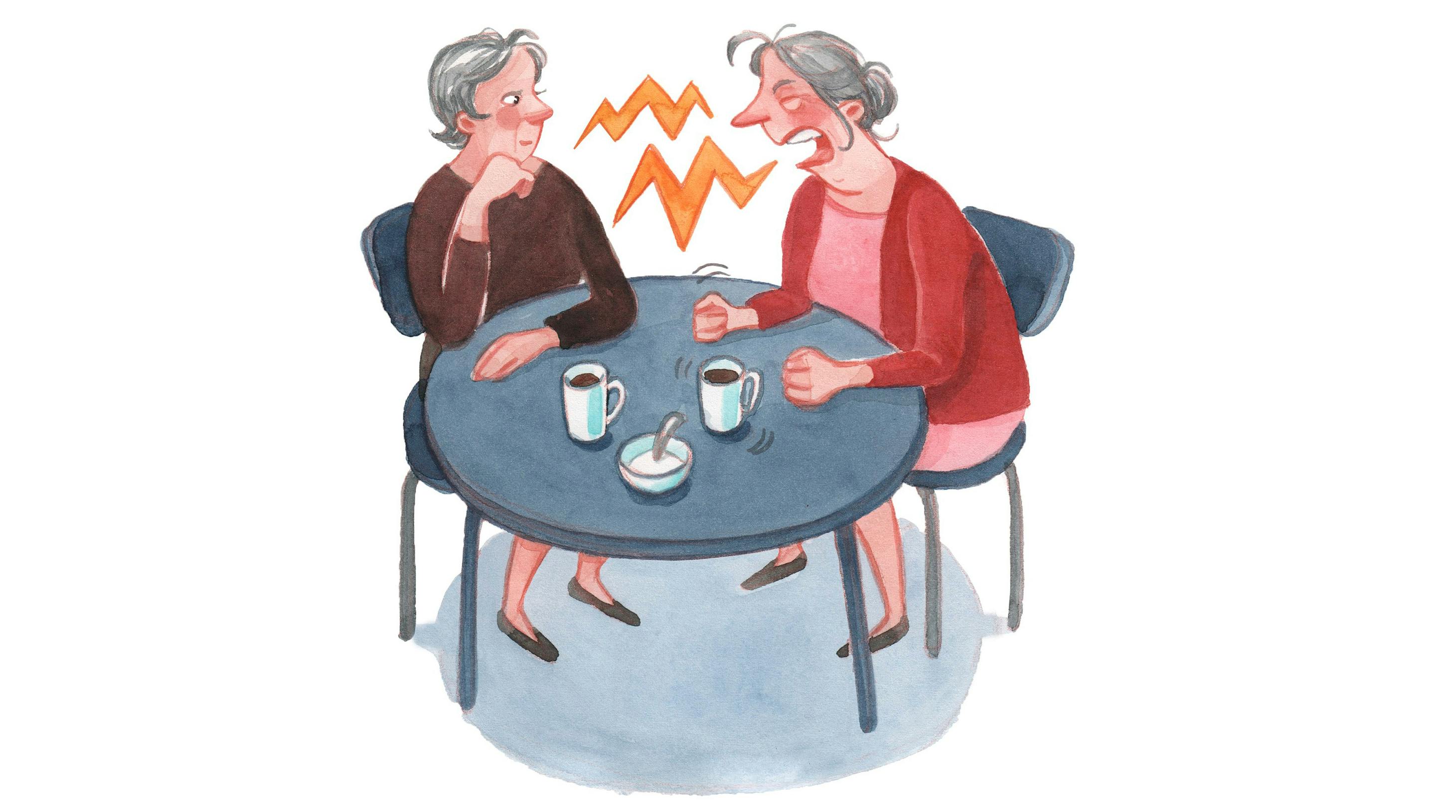 Men det er måske det, der er løsningen. Hvis du kan finde det i dit hjerte, så bank på, og drik en kop kaffe, mens naboen ventilerer sin ophobede vrede og får luft for alle sine frustrationer. Sig hende ikke imod, vær fødselshjælper og fisk al galde og negativitet ud af hende. Uden selv at tage det ind. Hun har nok brug for, at en eller anden hører hende til ende. Kan du overskue at være den, der lytter?