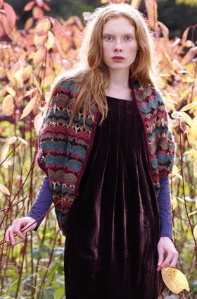 Materialer: "Rowan Kid Classic" (70% lammeuld/26% kid mohair/4% nylon/50 g = 140 meter): 2 ngl. af hver: Earth 872 (A), Spruce 853 (B), Bear 817 (C) og Crushed Velvet 825 (D) + 1 ngl af hver: Canard 871 (E), Peat 832 (F), Mellow 877 (G) og Straw 851 (H). Hæklenål nr. 4½.