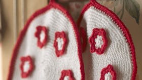 Blomst: Beg som ved grydelap og hækl 1. + 2. omg. Bryd garnet. Forts med rød: ?2 lm, spring 1 fm over, 1 fm i flg. m?, gtg ?-? omg rundt. Næste omg: Hækl i hver 2-lmbue: