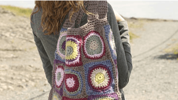 Taske: Hækl 2 ruder i hver fv-kombination A-I (5 farver i hver rude) = i alt 18 ruder.Hæklet rude: Beg med 3 lm i fv 1 og saml dem til en ring med 1 km.