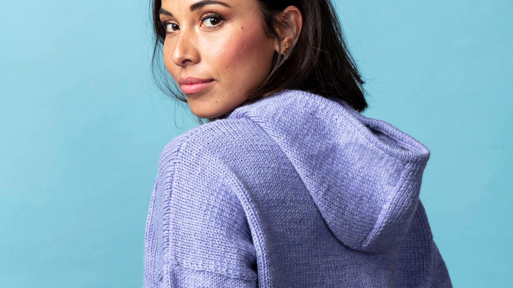 Hætte: Med rundp nr. 4,5 sættes garnet til midt for de 14 (14) 14 (16) 16 (16) aflukkede hals-m på forstykket. Strik 1 m op for hver aflukket m langs forstykkets aflukkede 7 (7) 7 (8) 8 (8) m, strik 15 m op langs de skrå aflukkede m og derefter 8 m op over det lodrette stykke op til skuldersømmen, strik 30 (30) 30 (32) 32 (32) m op over nakkens m, og strik derefter samme m-antal op over den anden halve side af forstykket, med helt samme fordeling af m. I alt 90 (90) 90 (94) 94 (94) m. Markér de midterste 14 m midt bag på hætten. Begyndelsen på omg er midt for.