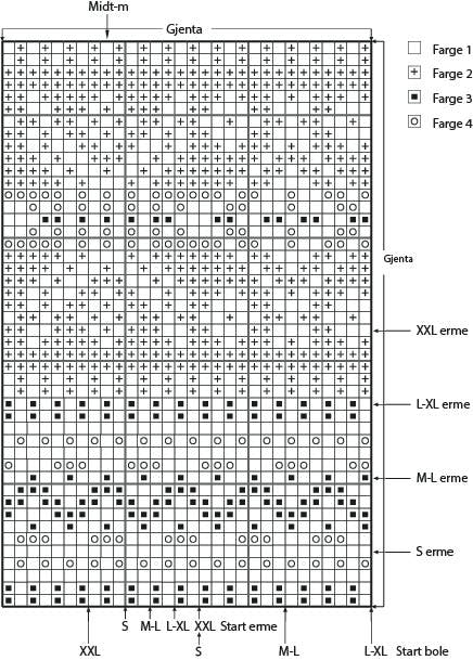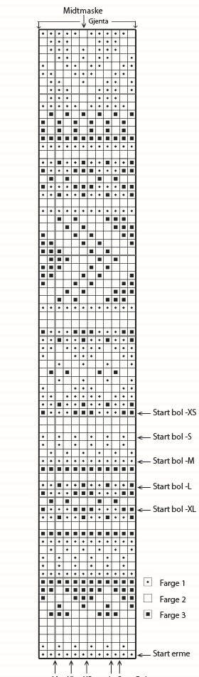 Sæt et mærke i hver side med 121 (129) 137 (151) 165 m til for-og bagstykket. Strik mønster efter diagrammet. Start ved pil for kroppen og valgt størrelse. Strik til sidemærket, og start på ny ved pilen. Strik diagrammet færdig.