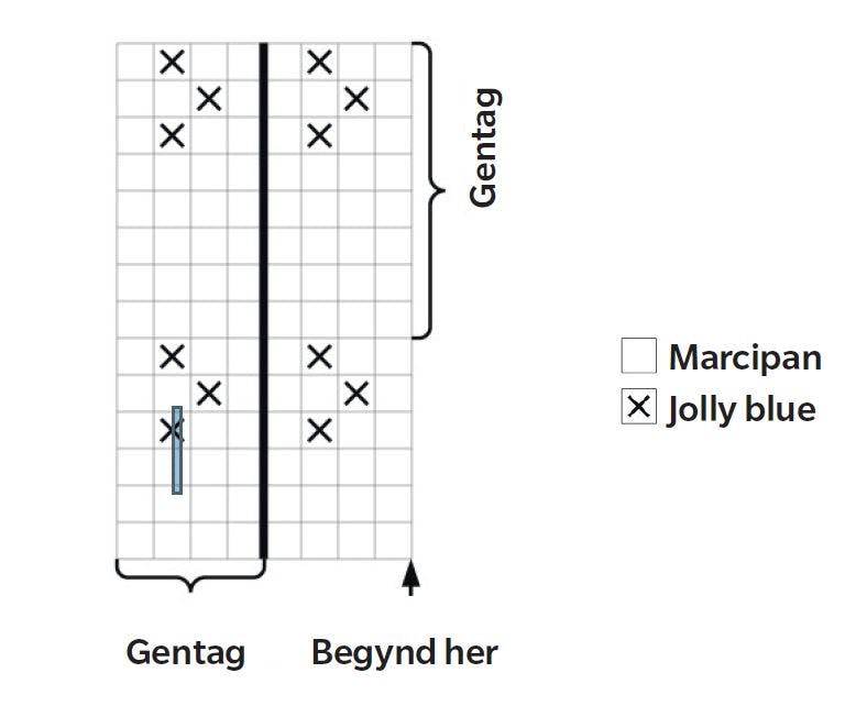 Bemærk: De 2 mærkemasker og indtagningsmaskerne strikkes hele tiden med marcipan.