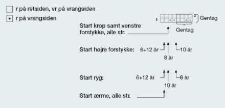 Venstre forstykke: Strikkes som højre forstykke, blot spejlvendt – det vil sige, at forkanten udgøres af de SIDSTE 3 m set fra retsiden. Når der skiftes til rib med start på en vrangsidepind, er det samme startpunkt i diagrammet for alle størrelser.