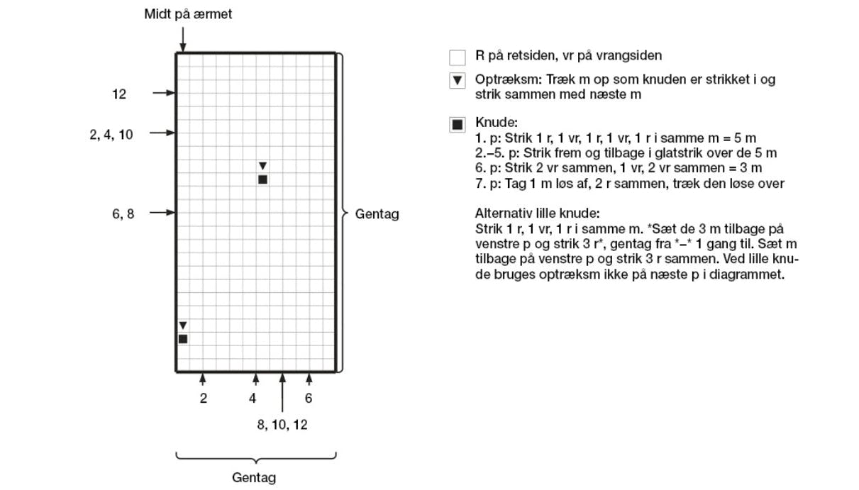 Ærmer: Slå 36 (40) 40 (44) 44 (48) 48 m på strømpep nr 3,5. Strik 8 (8) 10 (10) 12 (12) cm rundt i rib med 2 r, 2 vr. Skift til p nr 4. Strik 1 omgang r, samtidig med at der tages 17 (17) 21 (21) 21 (25) m ud jævnt fordelt = 53 (57) 61 (65) 69 (73) m. Strik mønster efter diagrammet. Begynd med omgangen mærket med pilen for den valgte størrelse i venstre side af diagrammet. Tæl ud fra midt på ærmet hvor på diagrammet mønsteret begynder. NB! Hvis der bliver mindre end 4 m mellem knuderne midt under ærmet, strikkes glatstrik i stedet for knude. Strik til ærmet måler ca 24 (27) 33 (36) 38 (40) cm. Afslut med samme omgang i mønsteret som på kroppen/for- og bagstykket. Samtidig, på sidste omgang, lukkes 8 m af midt under ærmet (= de 4 første og de 4 sidste m på omgangen) = 45 (49) 53 (57) 61 (65) m.
