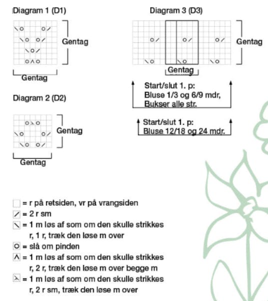 Strikkefasthed: 25 m x 34 p = 10 x 10 cm mønster efter D1 på pind 3 mm