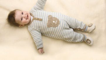 Materialer: "Dale Baby Ull" (100% merinould/50 g = 175 meter): (50) 50 (50) 50 g beige nr. 2641 (= fv 1) + (100) 150 (150) 150 g råhvid nr. 0020 (= fv 2) + (100) 150 (150) 150 g isblå nr. 6621 (= fv 3). Strikkep og rundp nr. 3 og 3½. Strømpep nr. 3½. Hæklenål nr. 3½. (9) 9 (9) 11 knapper. (Garn fra Mayflower, tlf. 77 34 14 88.)