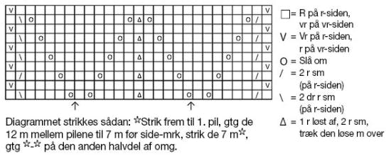 Skørt: Slå 198 (222) 246 (270) m op med dobbelt garn på rundp 3½. Bryd den ene tråd og forts rundt med enkelt garn. Strik 1 omg ret. Sæt 1 mrk i hver side med 99 (111) 123 (135) m til hver del. M på hver side af mrk er side-m, dvs. der er 2 side-m i hver side. Forts i mønster efter dia, idet mønstret placeres sådan: Strik 1 side-m (= 1. m i dia), strik dia til 1 m før næste mrk, strik 2 side-m (= sidste og 1. m i dia, mrk sidder mellem disse m), strik dia, til der er 1 m tilb på omg, strik 1 side-m (= sidste m i dia). Gtg dia i højden, til arb måler ca. 30 (35) 40 (45) cm – slut med et helt mønster i højden. Strik 1 omg ret og regulér samtidig m-tallet til 212 (228) 248 (268) m. Strik endnu 2 omgange ret. Del arb ved at lukke 20 (20) 22 (24) m til ærmegab i hver side (= 10 (10) 11 (12) m på hver side af mrk). Strik hver side færdig for sig.
