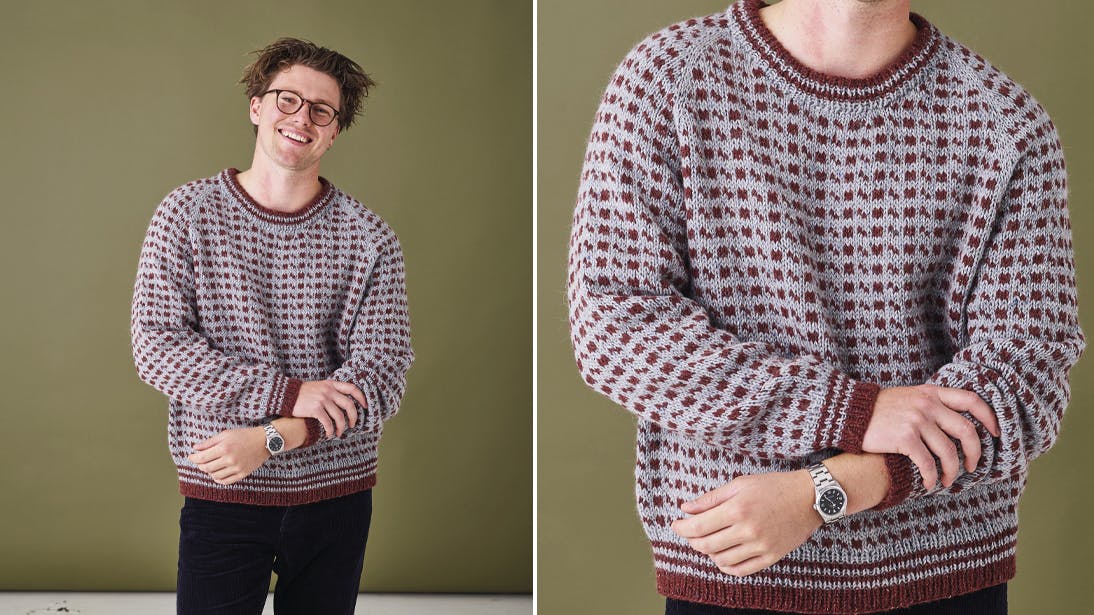 Strik nu efter diagram (se diagram på næste side) gennem resten af arb, samtidig med at der strikkes vende-p frem og tilbage i glatstrik, mens der på retsiden både laves raglan-udt og tages ud til halsudskæringen på forstykket således: Strik fra retsiden: 2 m i 1. m, ✩strik efter diagram til 1 m før markør, 1 udt, 1 r (strikkes ikke med i diagram, men strikkes med Lysegrå på alle p), markør, 1 r (strikkes ikke med i diagram, men strikkes med Lysegrå på alle p), 1 udt✩. Gentag ✩-✩ yderligere 3 gange. Strik 2 m i sidste m på p. Vend og strik vr tilbage.