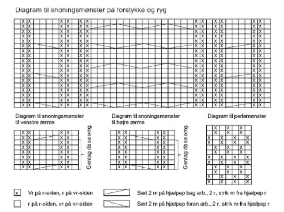 Ærmer: Slå 28 (30) 32 (32) m op på strømpep 7, og strik rundt. Strik 12 omg rib (1 r, 1 vr). Skift til strømpep 8, og strik 1 omg ret, idet der samtidig tages 0 (2) 4 (4) m ud = 28 (32) 36 (36) m. Strik herefter snoninger og dobbelt perlestrik efter dia med flg. inddeling: Strik 9 (11) 13 (13) m perlestrik, 10 m snoning til den ene arm, 9 (11) 13 (13) m perlestrik. Forts på denne måde, og tag samtidig 1 m ud på hver side af omg’s beg på hver 6. (6.) 5. (5.) omg til i alt 52 (58) 64 (70) m. (Strik de nye m i dobbelt perlestrik). Forts lige op, til ærmet måler 53 (56) 57 (57) cm eller ønsket længde til ærmegab. Luk nu de første og sidste 4 m på omg (= 8 m) til ærmegab. Strik ærmekuppel frem og tilb i mønster som før, og luk yderligere for 3, 2, 2, 2, 2 (3, 2, 1, 1, 1, 3, 2) 3, 2, 1, 1, 1, 3, 2, 1 (3, 2, 1, 1, 1, 3, 2, 1) m i hver side på 2. hver p. Luk de rest m af.