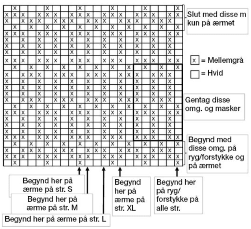 Ærme: Strikkes rundt. Slå 40 (40) 42 (44) m op på strømpep 6 mm med Navia Tradition grøn, strik 1 omg rib (1 r, 1 vr). Skift til Navia Tradition mellemgrå, og strik 1 omg r, strik derefter 11 omg rib (1 r,1 vr). Skift til strømpep 7 mm, og strik 1 omg r, hvor der tages jævnt ud til 45 (47) 51 (55) m. Strik herefter mønster efter diagrammet, men første og sidste m på alle omg strikkes med mellemgrå. Samtidig tages der 2 m ud midt på indersiden af ærmet på hver 5. omg i alt 7 (8) 9 (10) gange. Siden på hver 3. p, i alt 5 (6) 7 (8) gange, således: Strik 1 m mellemgrå, tag 1 m ud, strik, til der er 1 m tilbage på omg, tag 1 m ud, strik 1 m mellemgrå. Strik til ærmet måler ca. 52 (55) 57 (59) cm, slut med slutmønster (se diagram). Luk løst af.