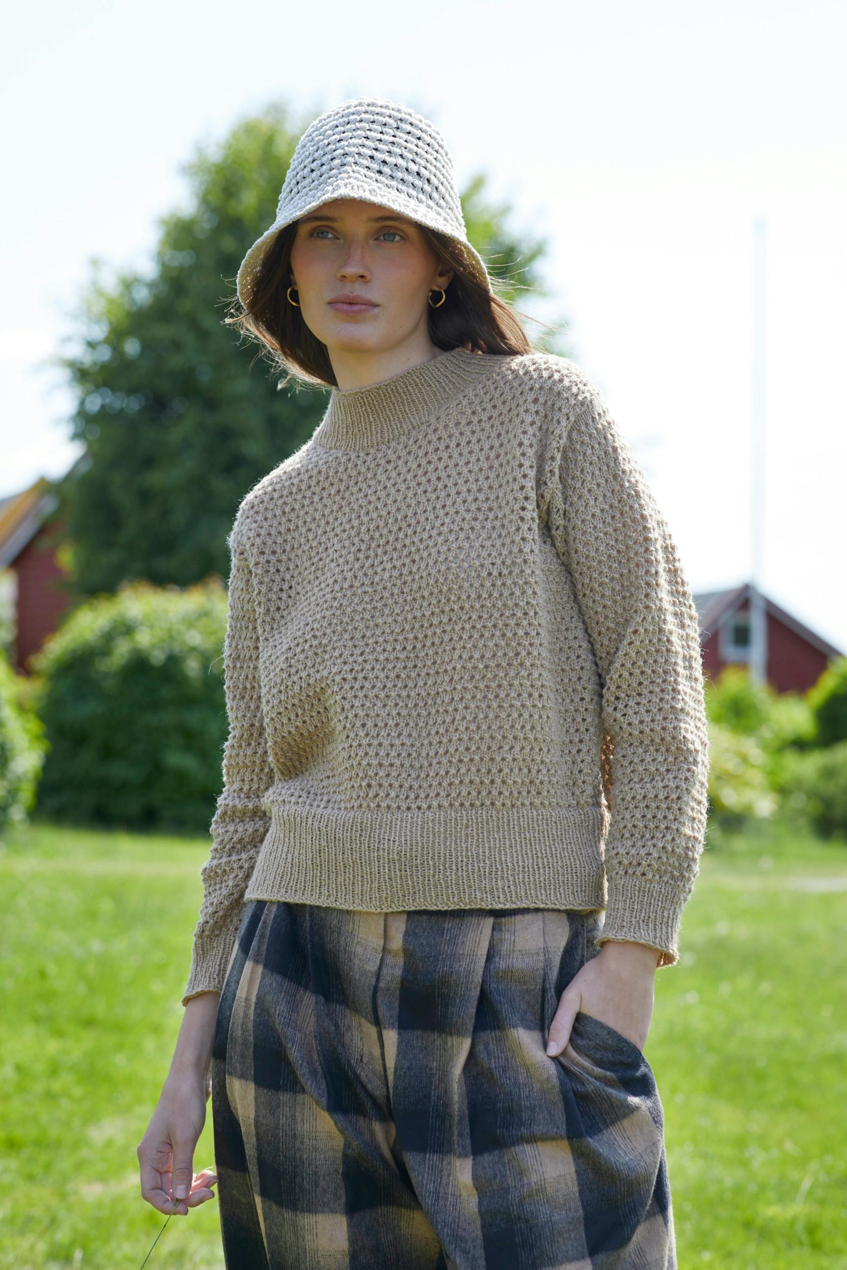 Denne bluse har en klassisk pasform, rund hals og ribstrikkede kanter. Den strikkes oppefra og ned i et pænt hulmønster. For at få en klassisk pasform vælges en størrelse med en brystvidde, som er 9-13 cm større end din egen.