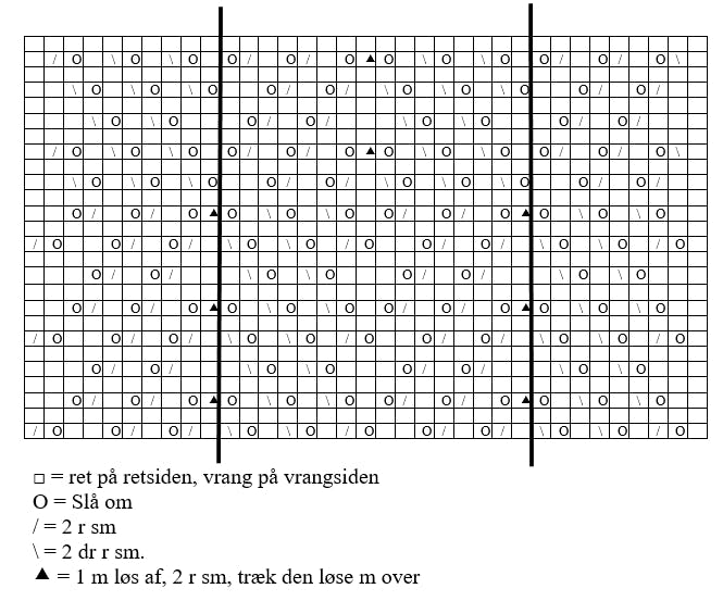 Strik på denne måde diagrammets 26 pinde. Gentag disse indenfor de 8 kantmasker i hver side, gennem hele arb. Strik til tørklæde måler ca 163 cm eller ønsket længde. Sut med diagrammets 25. pind. Strik 14 pinde ret, og luk af i ret.