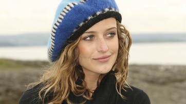 Hue: Huen strikkes rundt: Slå 120 (128) m op på rundp med 3 tråde sort garn. Strik 6 omg glat, derefter mønster efter dia A (= 4 omg) med 3 tråde i hver farve! Strik resten af huen med 2 tråde: Beg med blå og tag 8 m ud, jævnt fordelt, på 1. omg = 128 (136) m. Sæt nu 10 mrk i arb (med ca. 12-13 m's mellemrum). Forts rundt i glat og tag samtidig 1 m ud efter alle mrk på hver 2. omg i alt 8 gange = 208 (216) m. Strik mønster efter dia B (= 4 omg). Skift til petrol og strik huen færdig med denne, lav samtidig indt til begge str,: Tag 1 m ind efter alle mrk på hver 4. omg 6 gange, på hver 2. omg 8 gange og på hver omg 5 gange = 18 (26) m tilb. Næste omg: Strik alle m sm 2 og 2 = 9 (13) m. Bryd trådene og før enderne igennem rest m, træk sm og hæft.