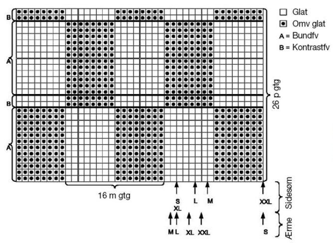Ærmer: Slå 72 (74) 76 (80) 84 m op på p 3½ med kontrastfv. Skift til p 3 og strik 1 p vr, så 6 p rib, idet 1. p strikkes sådan: 1 (0) 1 (1) 1 r, ✩2 r, 2 vr✩, gtg ✩-✩, og slut med 3 (2) 3 (3) 3 r. Skift til p 3½ og forts efter dia, idet der begyndes som angivet til ærme. På 3. p tages 1 m ud i hver side inden for den yderste m. Dette gentages på hver 6. (6.) 4. (4.) 4. p endnu 5 (1) 20 (19) 18 gange, derefter på hver 4. (4.) 0. (2.) 2. p i alt 12 (18) 0 (2) 4 gange = 108 (114) 118 (124) 130 m på p.