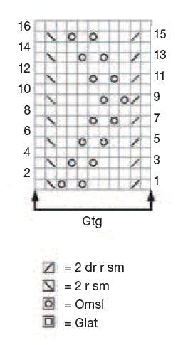 Ryg: Slå 92 (100) 112 (120) m løst op på p 4½. Strik 7 p rib (2 r, 2 vr), idet 1. p = vr-siden, og der tages 1 (3) 1 (3) m ud jævnt fordelt på sidste p = 93 (103) 113 (123) m. Forts nu i mønster efter dia, idet 1. og sidste m strikkes r på alle p og ikke tæller med i mønstret. Strik lige op, til arb måler 38 cm. Luk 3 m i hver side til ærmegab. Beg raglan-indt på næste p fra r-siden sådan: 1 kantm, 2 r sm, strik til de sidste 3 m, 1 r løst af, 1 r, træk løs m over, 1 kantm. Tag ind på denne måde på hver 2. p i alt 28 (30) 33 (36) gange = 31 (37) 41 (45) m. Lad de rest m hvile.