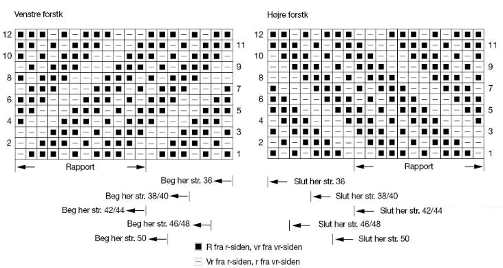 Venstre forstk: Slå 64 (74) 82 (90) 98 m op på p 2½ og strik 7 p rib (1 r, 1 vr). Næste p (vr-siden): 6 (4) 8 (5) 9 vr, 2 vr sm, ✩5 vr, 2 vr sm✩, gtg ✩-✩ i alt 7 (9) 9 (11) 11 gange, 7 (5) 9 (6) 10 vr = 56 (64) 72 (78) 86 m. Skift til p 3 og strik mønster efter dia. Strik lige op, til arb måler som ryggen til ærmegab. Luk af til ærmegab i arb’s højre på samme måde som på ryggen. Forts derefter lige op, til ærmegabet måler 9 (11) 12 (13) 14 cm. Luk nu i arb’s venstre side for 9 (12) 12 (13) 14 m til hals og tag derefter 1 m ind i samme side på hver p i alt 3 (3) 5 (7) 7 gange, så på hver 2. p 4 (4) 3 (2) 2 gange, så på hver 4. p 2 (2) 1 (1) 1 gange og endelig på hver 6. p 2 (2) 3 (3) 3 gange = 28 (33) 40 (42) 49 m. Når arb måler som ryggen til skulder, lukkes i arb’s venstre side 9, 9 (10, 11) 13, 13 (13, 14) 16, 16 m på hver 2. p til skulder. Luk de rest 10 (12) 14 (15) 17 m.