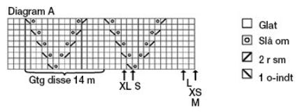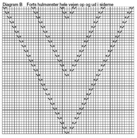 Bagstk: Slå 105 (111) 119 (129) 137 m op på p 3½. Skift til p 3 og strik 9 p ret. Skift til p 3½ og strik 4 p glat. Strik dia A (= 9 p) – beg fra r-siden som angivet af pilen til den valgte str. Forts i glat og tag 1 m ind i hver side på 4. p sådan: 14 r, 1 o-indt, strik til de sidste 16 m, 2 r sm, 14 r. Gtg disse indt på hver 22. p endnu 6 gange = 91 (97) 105 (115) 123 m. Samtidig, når arb måler 48 (48) 48 (49) 50 cm, begyndes på dia B på en p fra r-siden – sæt 1 mrk om den midterste m og strik 1. p i dia sådan: Strik r til mrk, slå om, 1 o-indt, strik r pinden hen. Forts med V-hulmønstret efter dia hele vejen op. Hver gang der er strikket 24 p mønster, begynder et nyt V på midten. Alle de skrå hulrækker fortsætter helt ud i siderne, til der er 2 m til kanten. Samtidig, når arb måler 67 (67) 67 (68) 69 cm, lukkes 10 (11) 13 (15) 17 m i hver side til ærmegab = 71 (75) 79 (85) 89 m. Sæt 1 mrk midt på arb i denne højde (mrk skal ikke flyttes med op). Tag derefter 1 m ud i hver side på 5. p efter ærmegab sådan: Strik 3 m, 1 udt, strik til de sidste 3 m, 1 udt, strik 3 m. Gtg udt på hver 6. p endnu 7 (8) 8 (9) 9 gange = 87 (93) 97 (105) 109 m. Forts lige op, til arb måler 18 (19) 20 (21) 22 cm fra mrk i midten. Luk nu 2 x 2 m og 5 x 3 m (7 x 3 m) 1 x 4 m og 6 x 3 m (3 x 4 m og 4 x 3 m) 4 x 4 m og 3 x 3 m i hver side til skuldre. Samtidig, når der er lukket af 2 gange i hver side, lukkes de midterste 43 (45) 47 (51) 53 m til halsudskæring, og hver side strikkes færdig for sig. Luk i halssiden for yderligere 1 x 2 og 1 x 1 m. Strik den anden side færdig på samme måde, men spejlvendt.