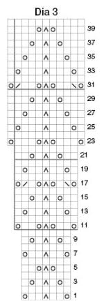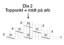 Gtg de sidste 2 p, til dia 3 er strikket færdigt i højden (der vil gradvist komme flere m glat omkring de 3 midterm samt i hver side indenfor de 2 yderste m). Luk af i r fra vr-siden. Hæft alle ender.