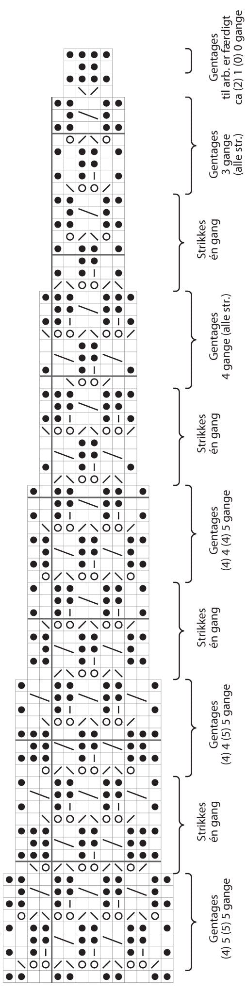 Forstk: Slå (114) 123 (133) 143 m op. Strik 2 p r (1. p = vr-siden). Inddel nu arb med mrk til felter med hhv. glatstrik og hulmønsterkiler efter dia sådan: Strik (73) 79 (85) 91 r, sæt mrk, strik dia, sæt mrk, 5 r, sæt mrk, strik dia, sæt mrk, (8) 11 (15) 19 r. Forts med denne inddeling i glat og hulmønster efter dia på resten af arb. Når arb måler (42) 43 (44) 45 cm lukkes til ærmegab i begge sider på hver 2. p for (3, 1, 1, 1) 4, 2, 1, 1, 1 (5, 3, 2, 1, 1, 1) 6, 3, 2, 2, 1, 1, 1, 1 m. Strik, til arb måler (55) 56 (58) 59 cm, slut med en p på arb’s r-side. Luk nu til halsudskæring sådan: Strik (27) 28 (28) 28 m, luk de næste (28) 29 (31) 33 m til halsudskæring og strik p ud. Nu strikkes hver side op for sig. Mod halssiden lukkes herefter 2 m på hver 2. p 3 gange. Luk nu 1 m af på hver 2. p (4) 5 (5) 5 gange og strik lige op, til arb måler (60) 62 (64) 66 cm. Luk skulderens 17 m. Strik den anden side magen til.