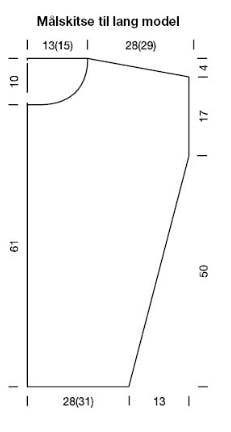 Ryg: Slå 140 (148) m op og strik 1 p vrang. Forts i mønster, idet der tages 1 m ud i hver side på hver 6. p i alt 14 gange og herefter på hver 4. p 18 gange = 204 (212) m. De nye m strikkes ind i mønstret, efterhånden som de opstår. Når arb måler 67 cm, lukkes til skulder i hver side på hver 2. p for 7 x 10 m. Luk de sidste 64 (72) m af.