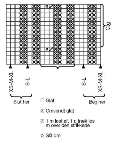 Strikkefasthed: 30 m x 36 p = 10 x 10 cm i let strakt mønster efter dia.