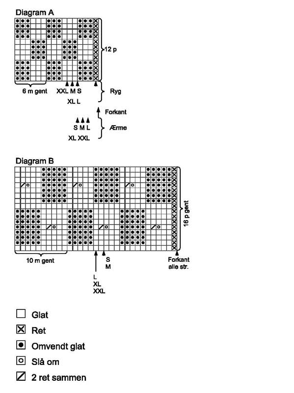 Ærmer: Slå 45 (47) 49 (51) 53 m op på p 3½. Skift til p 3 og strik dia A (= 12 p). Beg ved pilen for ærme i den valgte str. Skift til p 3½ og strik resten af ærmet i glat. Tag 1 m ud i hver side på 3. p sådan: 2 r, 1 udt, strik r til de sidste 2 m, 1 udt, 2 r. Gtg disse udt på hver 6. p endnu 19 (17) 13 (11) 9 gange, så på hver 4. p i alt 0 (3) 9 (12) 15 gange = 85 (89) 95 (99) 103 m. Forts lige op, til arb måler 42 cm. Luk nu af til ærmekuppel i hver side på hver 2. p for 5, 2, 2 (6, 2, 2) 7, 2, 2 (8, 2, 2) 9, 2, 2 m = 67 (69) 73 (75) 77 m. Tag derefter 1 m ind i hver side på hver 2. p inden for kantm, til der er 41 (39) 41 (39) 37 m tilb. Luk til sidst for 2, 3, 4 m i hver side på hver 2. p. Luk de rest 23 (21) 23 (21) 19 m af. Strik det andet ærme på samme måde.