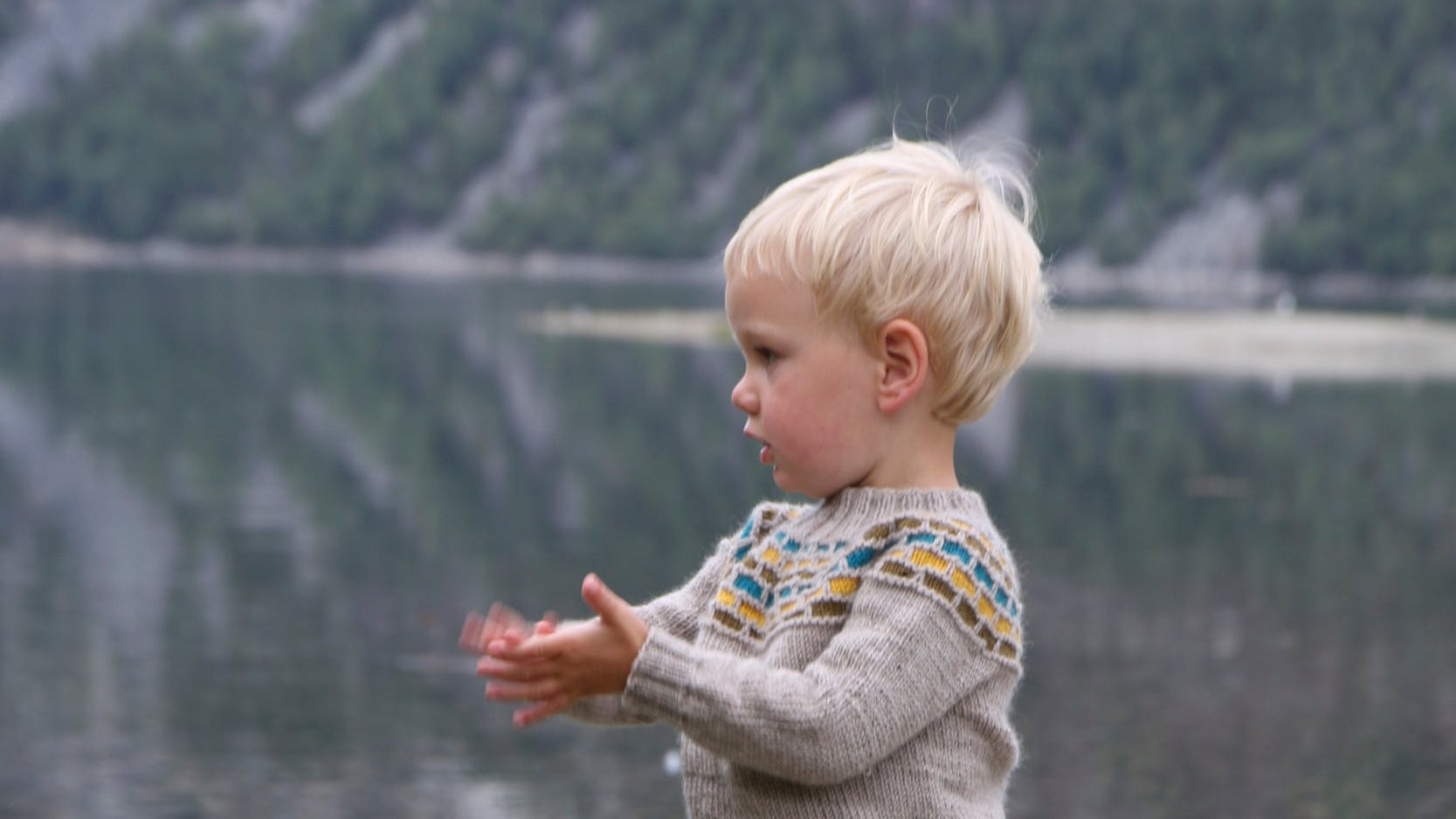 Slå 76 (76) 80 (84) 84 masker op på en kort 3 mm rundpind med bundfarven (BF), og strik ca. 4 cm rundt i rib, 2 ret, 2 vrang. Jo mere hold, des bedre, da ribben vil strække sig i brug – lad derfor være med at slå alt for løst op. Sørg blot for, at åbningen passer over barnets hoved.