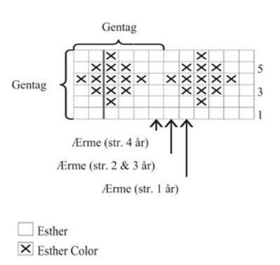 Ærmer: Slå (40) 44 (44) 48 m op med Esther på strømpep 2½ mm, og strik (3,5) 4 (4) 4,5 cm rundt i rib (1 r, 1 vr). Sæt en markør i omg start. Skift til strømpep 3 mm. Fortsæt i glatstrik og efter diagram (start mønster ved pilen for den respektive størrelse), samtidig med at der tages 1 m ud på hver side af markøren således: ✩1 m før markør, løft lænken mellem m op bagfra med venstre p, strik den r, 1 r, markør, 1 r, løft lænken mellem m op forfra med venstre p, og strik den dr r✩. Gentag ✩-✩ på hver (6.) 8. (8.) 8. p i alt 7 (7) 8 (8) gange = (54) 58 (60) 64 m.