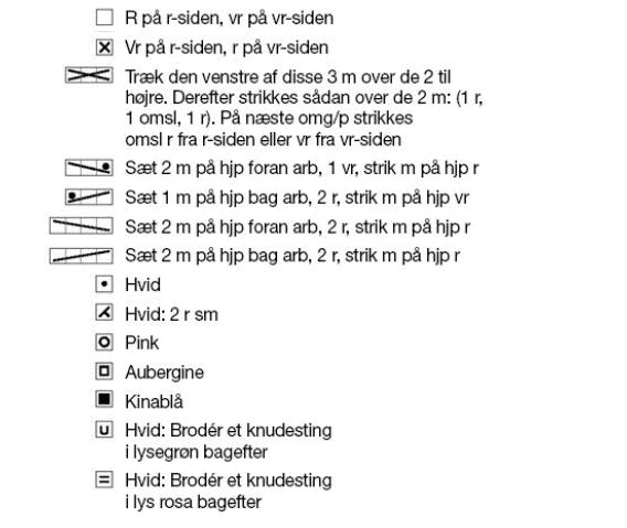Materialer: ”Falk” (100% ren, ny superwash uld/50 g = 106 meter): 8 (9) 9 (10) ngl lys gråmeleret 0004. 1 ngl af hver (alle str): Hvid 0017, lysegrøn 9133, lys rosa 4205, pink 4516, kinablå 5943 + aubergine 5052. Lang rundp + strømpep nr. 4 og 4½. Kort rundp nr. 4. Hjælpepind (hjp). (Garn fra Dale Garn).
