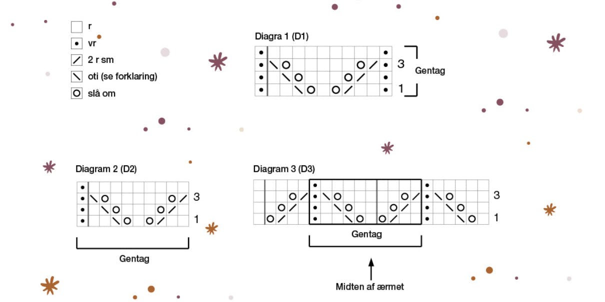 Der er nu (45) 47 (49) 51 m på omg. Fortsæt lige op, til ærmet måler ca. (45) 45 (44) 44 cm fra ærmegabet – slut med rk. 4 i D1. Strik 4 omg mønster efter D3 over alle m – tæl ud fra midten af ærmet, og sørg samtidig for, at der er lige mange omslag og sammenstrikninger på de enkelte omg.