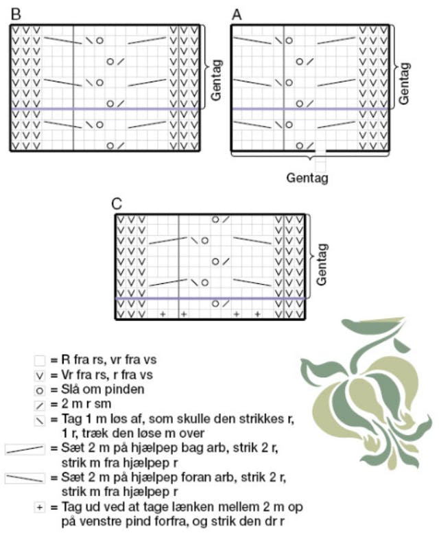 Krop: Slå 221 (234) 260 (286) 312 (338) m op på p 3 mm. Strik 10 omgange r (= rullekant). Næste omgang strikkes således: ✩6 r, tag 1 m ud ved at løfte lænken mellem 2 m op på venstre p forfra, og strik denne dr r, 7 r, tag 1 m ud✩, gentag ✩-✩ omgangen ud = 255 (270) 300 (330) 360 (390) m. Fortsæt rundt i mønster efter diagram A i alt 18 cm. Næste omgang strikkes således: ✩5 r, 2 r sm, 6 r, 2 r sm✩, gentag ✩-✩ omgangen ud. NB: I str. XS droppes sidste indtagning = 222 (234) 260 (286) 312 (338) m.
