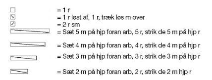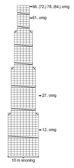 Bærestk: Strik nu alle delene sm på den lange rundp 4 til bærestk og inddel til snoninger sådan: Strik ryggens m, derefter m på det ene ærme, forstk og endelig m fra det andet ærme. Inddel samtidig m og tag ud til snoninger sådan: Strik 3 vr, ✩2 r, 1 udt (dvs. løft lænken mellem m op og strik den dr r), 2 r, 1 udt, 2 r, 1 udt, 1 r, 5 vr ✩, gtg ✩-✩ omg rundt, slut med 2 vr = 23 (25) 27 (29) snoninger med 5 vr imellem hver omg rundt. Strik glat (dvs. r) over snoningernes 10 m og omv glat (dvs. vr) over de 5 m imellem. Strik snoninger med indt som vist i dia. Tag samtidig ind i vr-banerne mellem snoningerne sådan:
