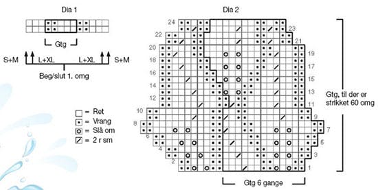 1. omg: ✩1 vr, 3 r, sæt mrk, (93) 103 (111) 121 m rib efter dia 1, sæt mrk, 3 r, 1 vr✩, gtg ✩-✩ på ryggen. Bemærk forskellige start- og slutpunkter i dia 1 for de enkelte str. Strik (3) 7 (9) 13 omg lige op med denne inddeling.