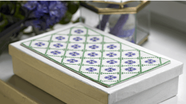 Arbejdsgang: Mal æsken hvid. Broder motivet i hele korssting med 2 deltråde, idet 1 tern i diagrammet svarer til 2 x 2 tråde i stoffet. Der skal være 3 x 5 motiver i alt. Pres det færdige broderi fra vrangen, og stryg vlieseline på vrangen. Kartonstykket ud i broderiets mål. Fold broderiet om kartonstykket og lim det på låget.