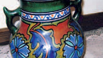 Vasen med to ører/håndtag er fremstillet på keramikfabrikken Gouda i Holland i 1930'erne. Disse farvestrålende keramikting har været samlerobjekter herhjemme, men i de senere år er efterspørgslen faldet drastisk. Derfor lyder vores vurderingspris nu kun på omkring 400-500 kr.