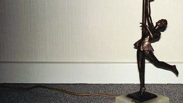 Vi har købt denne lampe på et antik-loppemarked. Jeg håber, I kan vurdere, om den er noget værd. Foden er af marmor eller alabast. Figuren ligner en gymnastikpige fra 1920'erne eller 1930'erne i bronze. Der er ingen stempler eller navn på lampen. Den måler 40 cm i højden.