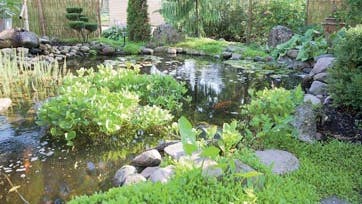 Planterne er også vigtige. Dels får de bassinet til at se naturligt ud, og dels er de også med til at holde vandmiljøet i en naturlig balance. I det store bassin er der både brugt sumpplanter, vandplanter og flydeplanter, der har hver sin funktion i økosystemet. Det krystalklare vand skyldes også et biologisk rensefilter, som Leon selv har bygget. Der er masser af koi karper i bassinet, og så er det helt nødvendigt, at vandet kommer igennem et filter, så det renses for næringsstoffer og urenheder.