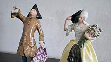 Jens Jacob Bregnøe og Hans Tegner har lavet disse tre figurer af porcelæn for Bing & Grøndahl. Figurerne er af porcelæn og dekoreret i overglasuren. Bliver de solgt på auktion, ligger vores vurdering på 3.000 kr. stykket. Men de kan muligvis indbringe endnu mere, da de er sjældne.