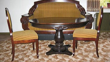Jeg vil gerne have jer til at kigge på denne spisestue med fire stole, en sofa og en lænestol. Disse møbler er hjembragt fra den amerikanske stat Iowa omkring 1906 af mine tipoldeforældre, og de har været i familiens eje siden. Møblerne blev ombetrukket i 1960 eller deromkring. Hvad tror I, at de samlet kan vurderes til?