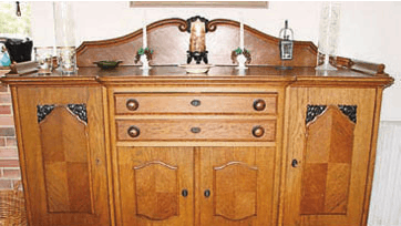 Den rummelige skænk af egetræsfinér er fremstillet i 1930'erne og har oprindelig været en del af en hel spisestue. Det er imponerende snedkerarbejde, men denne type tunge og meget kompakte møbler er der i dag kun beskeden efterspørgsel på. Derfor ligger en vurderingspris på under 1.000 kr.