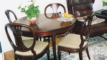 Vi er nødt til at skille os af med denne spisestue, da vi skal flytte til noget mindre. Hvad tror I, den vil indbringe ved salg på auktion? Der er dette spisebord med seks stole til.