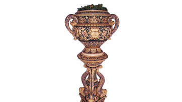 Din urtepotteskjuler med piedestal er en såkaldt majolika. Ordet betyder egentlig "keramik fra Mallorca". Den stammer fra omkring år 1900 og er ganske rigtigt fremstillet på den svenske fabrik Rörstrand. Den store urtepotte på tilhørende søjle er rigt dekoreret med blomster-ornamenter, dyrehoveder m.m. Den er ret flot. Med skader lyder vurderingen på 5.000 kr. Skaderne kan naturligvis restaureres, afhængig af hvor slemme de er.